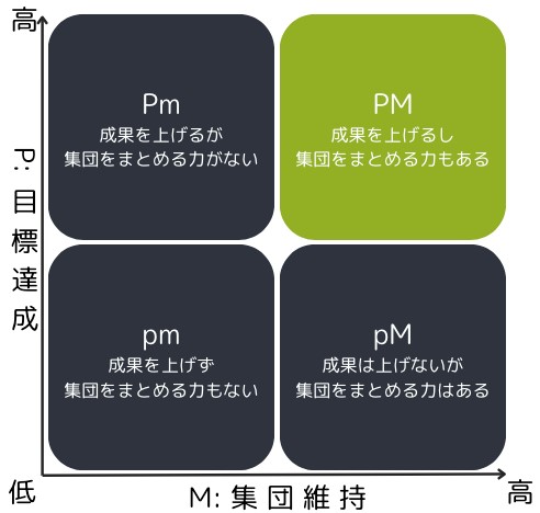 リーダーシップ理論の一つとして有名なPM理論では、プラチナ企業に共通する考え方が長年にわたり重視されてきました。PM理論は、リーダーの機能をP機能「目標達成機能」とM機能「集団維持機能」に分類し、それぞれのバランスを取ることで効果的なリーダーシップを目指す理論です。