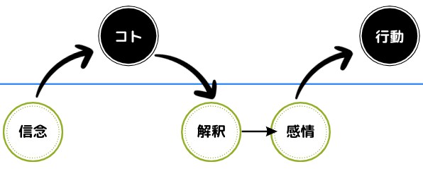 では「コト」から「行動」に繋がる時、その水面下では何が起こっているのでしょうか。水面下で起こっていることを、「信念」「解釈」「感情」という要素に分けて考えていきましょう。